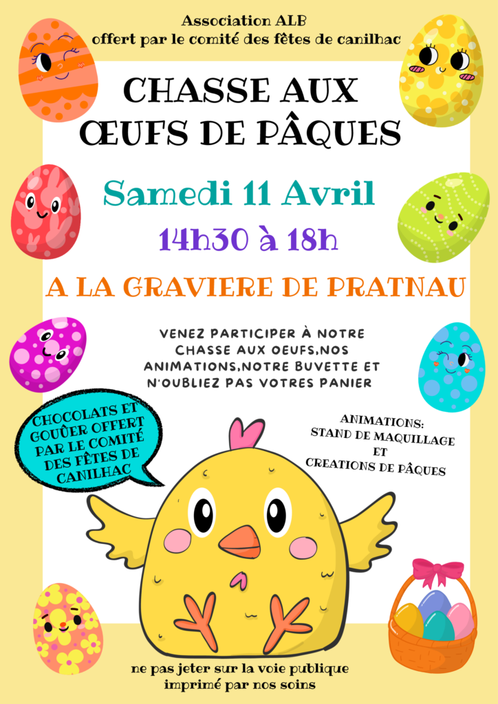 L’ALB et Le Comité des Fêtes de Canilhac donnent rendez-vous aux enfants pour la désormais traditionnelle Chasse aux Œufs à la gravière de Pratnau le samedi 11 avril 2026 à partir de 14h30.
